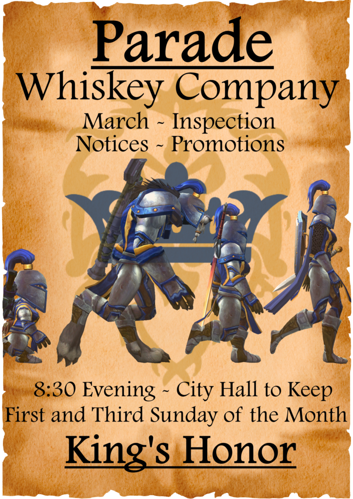 Nineteenth of January – Parade – A wonderful turn out of eighteen Guards on Parade. Everyone looked spiffier in their Uniforms. Notices included remembering discipline, being polite to fellow Military Members and what roles are available within the company. Promotions included Astriel Rosebrook, Eleanor Morgan and Istahla Shadowbane to Constable along with Y’nyssa to Junior-Constable.