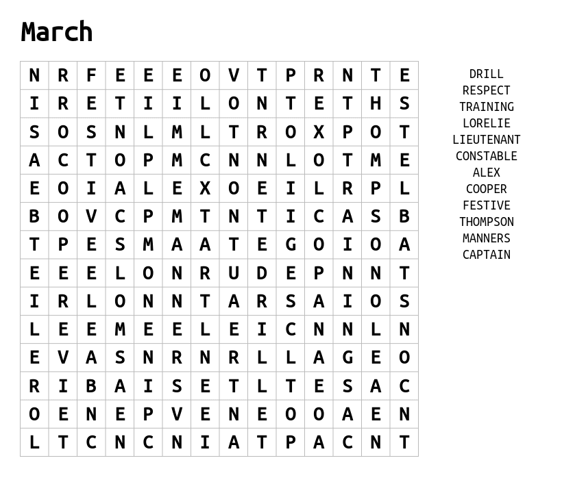 Thirtieth of March – Party – The annual Presentation evening. A short march, awards to members of the unit, notices, promotions and plenty of fun.